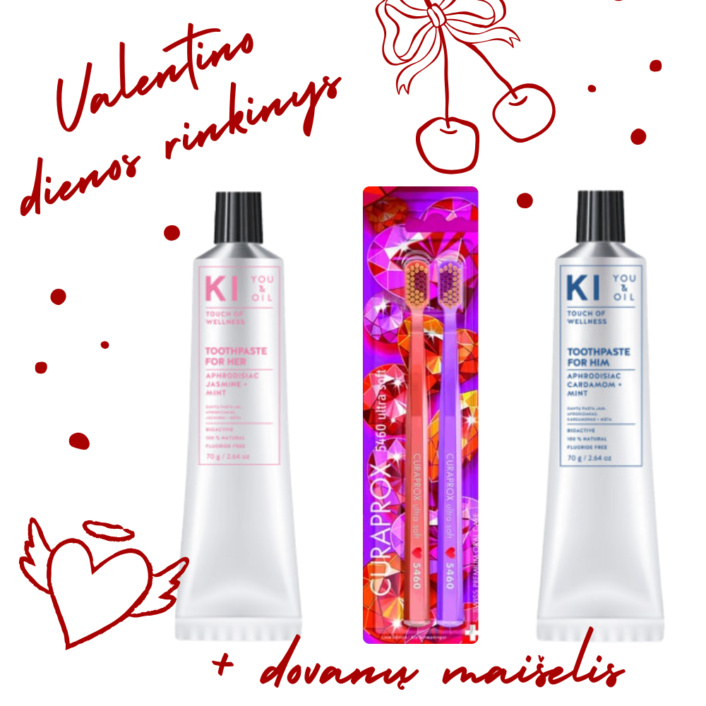 Afrodiziaku praturtintos You & Oil dantų pastos jam ir jai, du išskirtinio Valentino dienos dizaino Curaprox šepetėliai ir elegantiškas raudonas Hygēa dovanų maišelis. Tobula dovana porai, kuri nori šypsotis, flirtuoti ir mėgautis akimirkomis kartu.